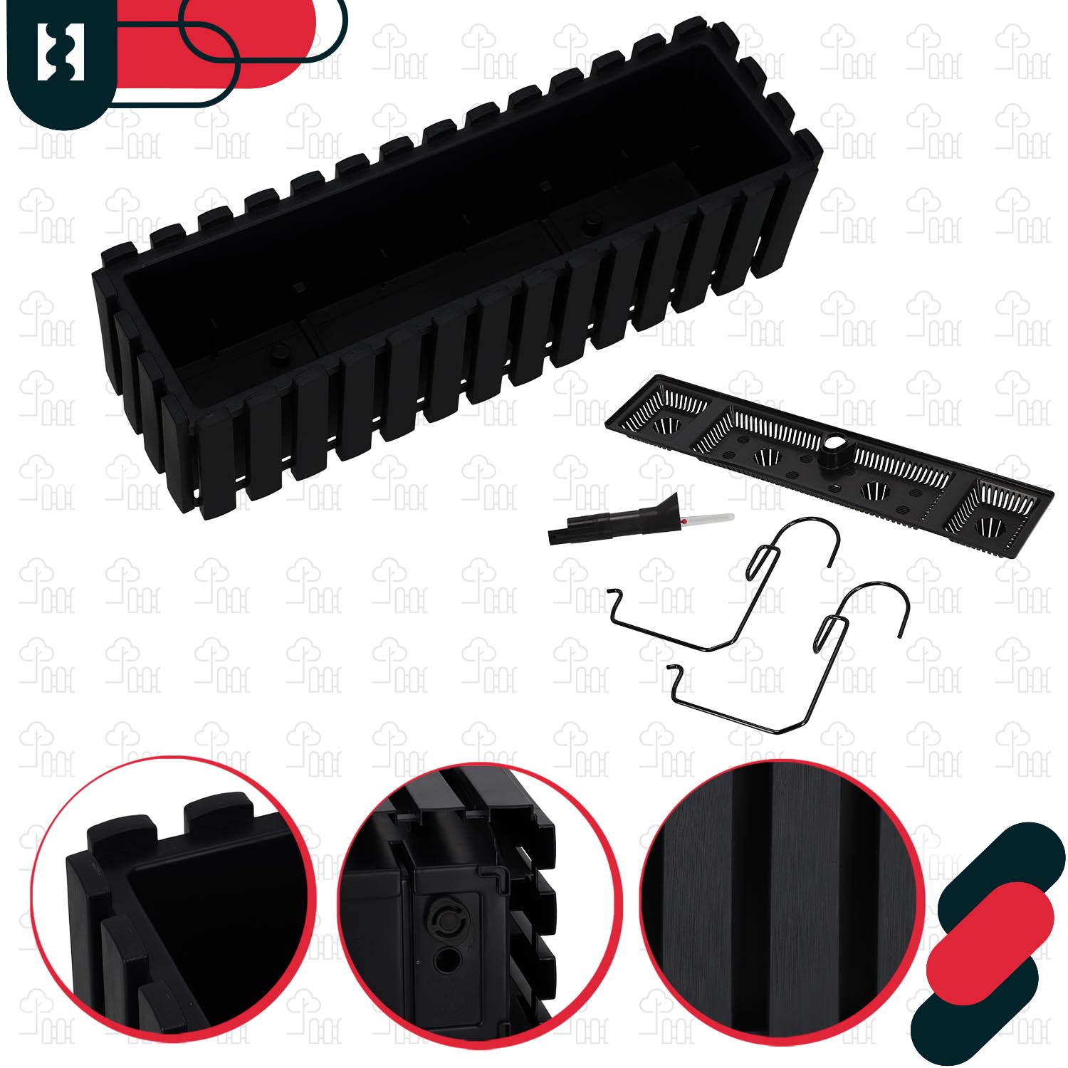 - Každý květináč je vybaven praktickými montážními háčky, které umožňují snadné a stabilní zavěšení např. na zábradlí balkonu nebo na madlo terasy.