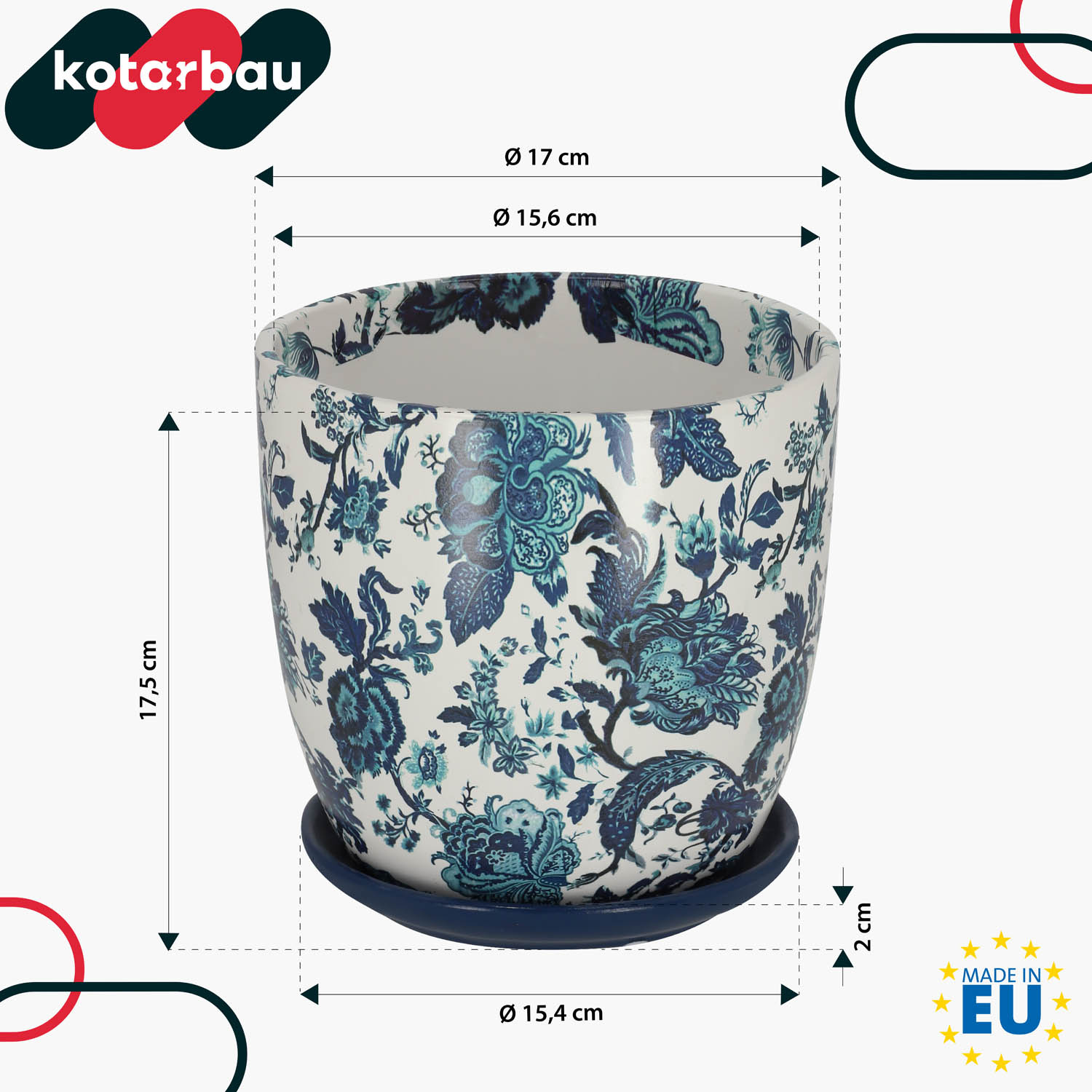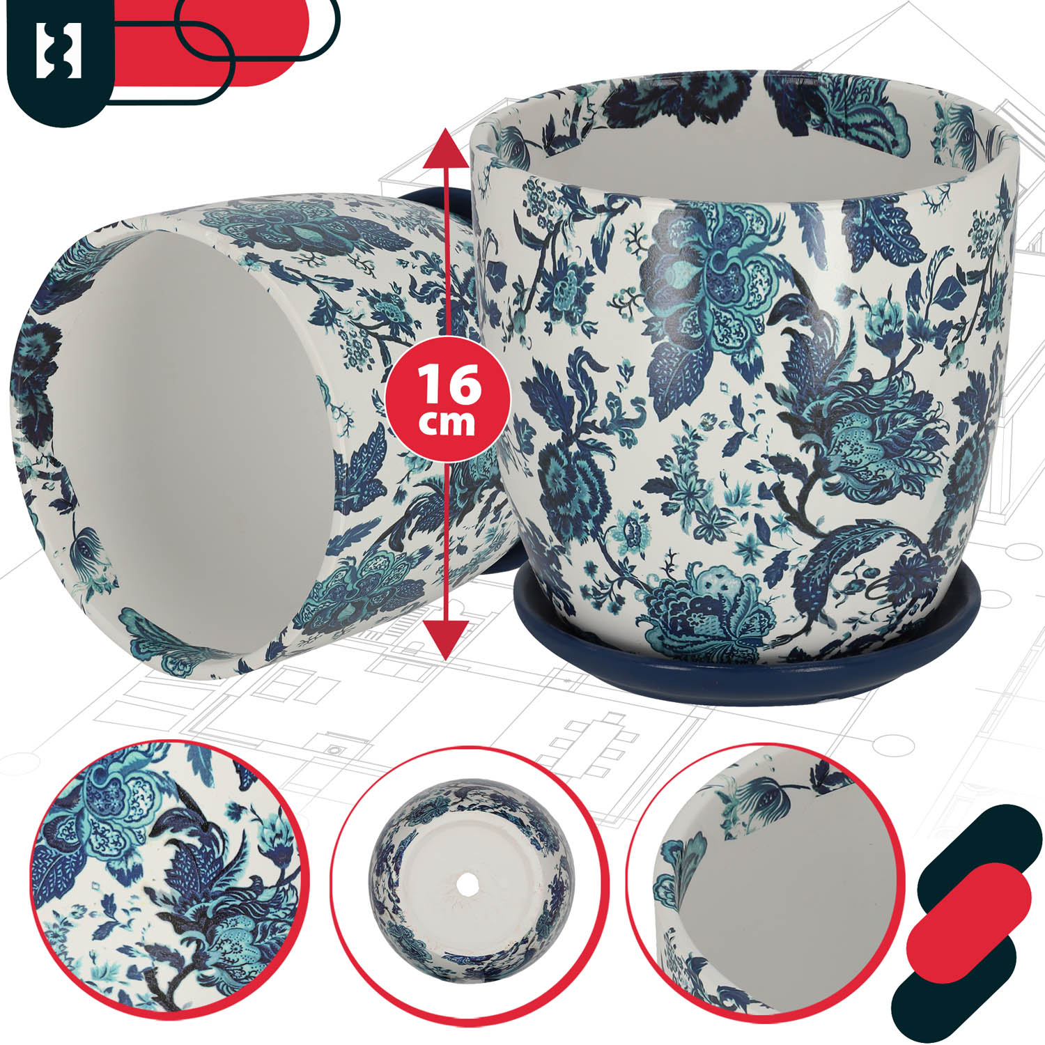 Květináč keramický s podmiskou modré květy bílý 17x17,5 cm