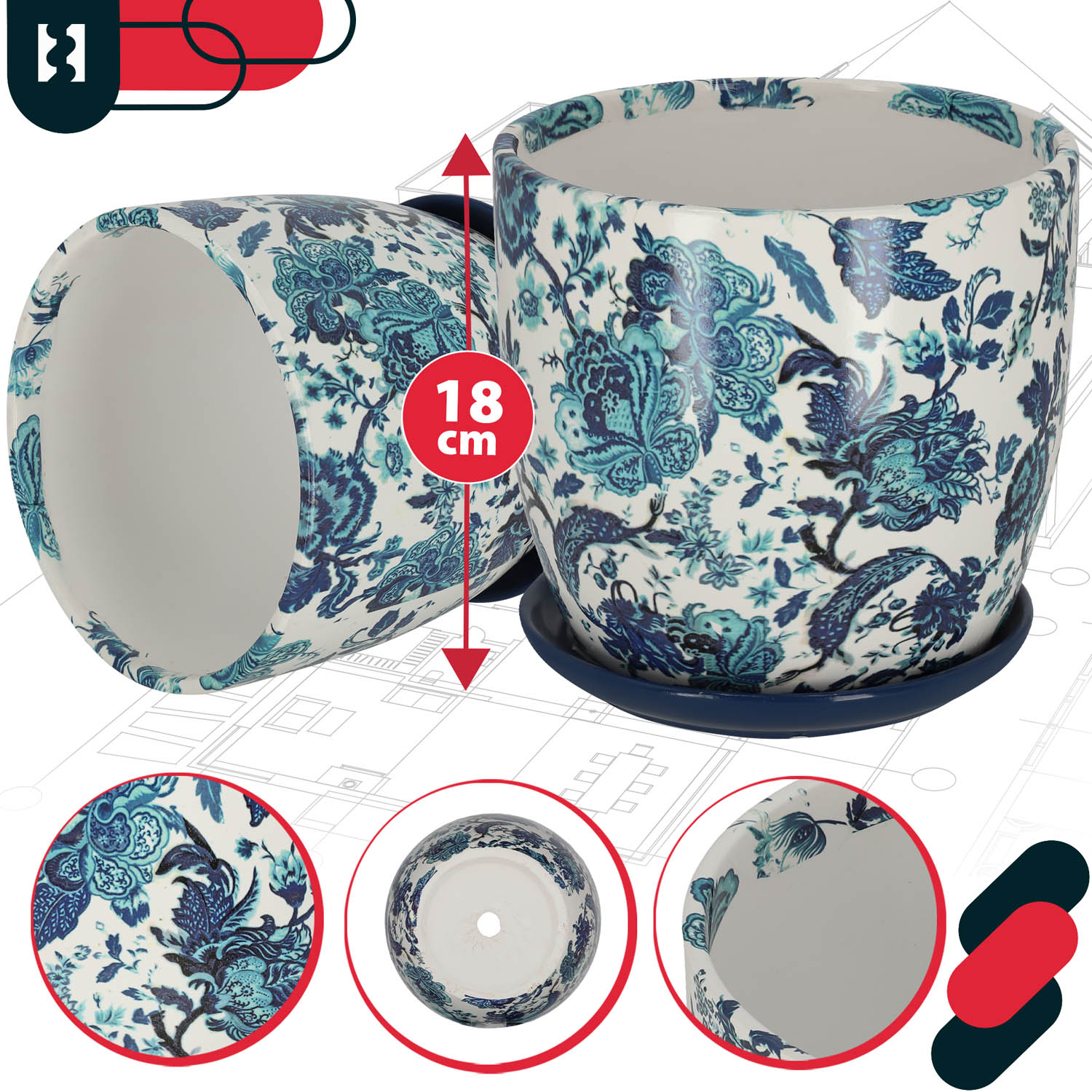 KVĚTINÁČ KERAMICKÝ S PODMISKOU MODRÉ KVĚTY BÍLÝ 20X19,5 CM