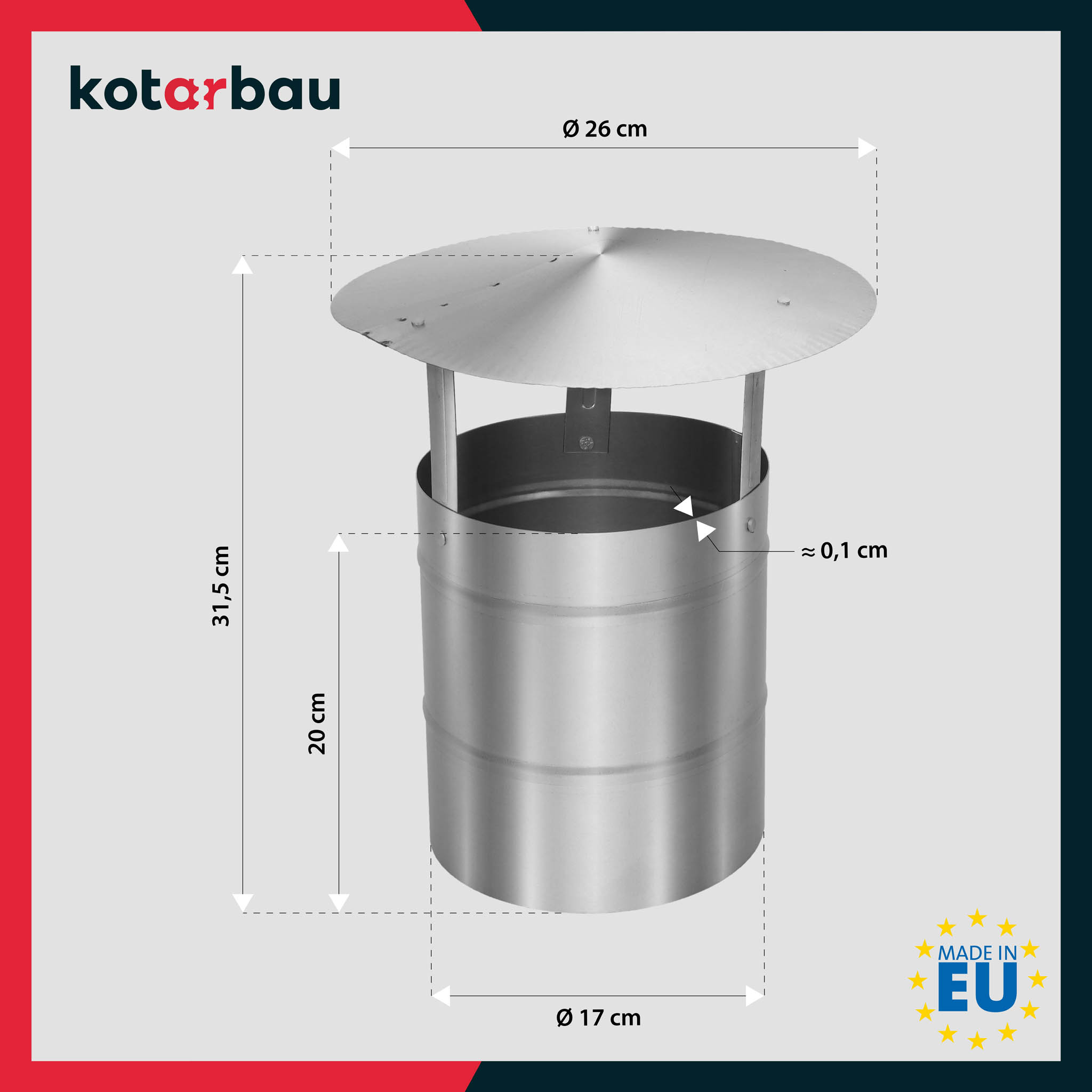 • Komínová stříška je vyrobena z vysoce kvalitní pozinkované oceli, odolné proti korozi a mechanickému poškození. Proces zinkování vytváří účinnou ochrannou vrstvu, která chrání kov před rzí i v prostředí se zvýšenou vlhkostí.